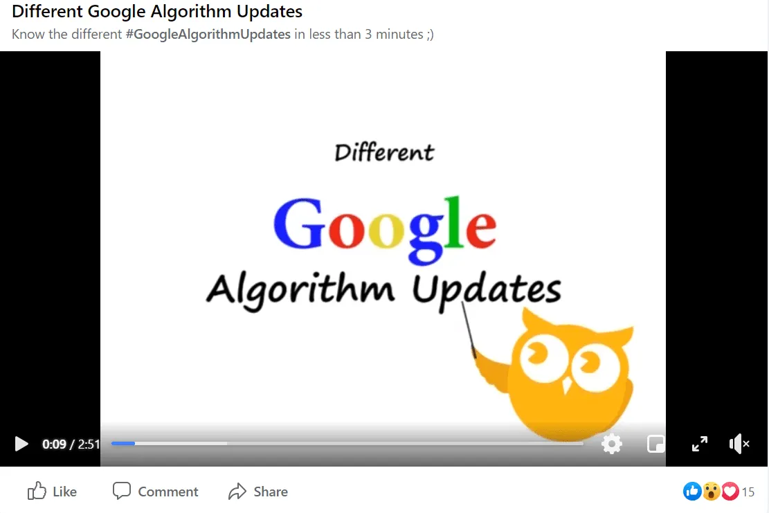 You can repurpose your blog posts into tiny yet attractive visual posts to market through social media channels. For instance, here’s a blog post on Google algorithm update converted into a user-friendly video post.