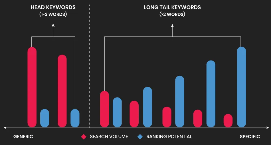 Long-tail keywords contain more specific terms and words than usually searched terms, which has a lower search volume and higher conversion rate.