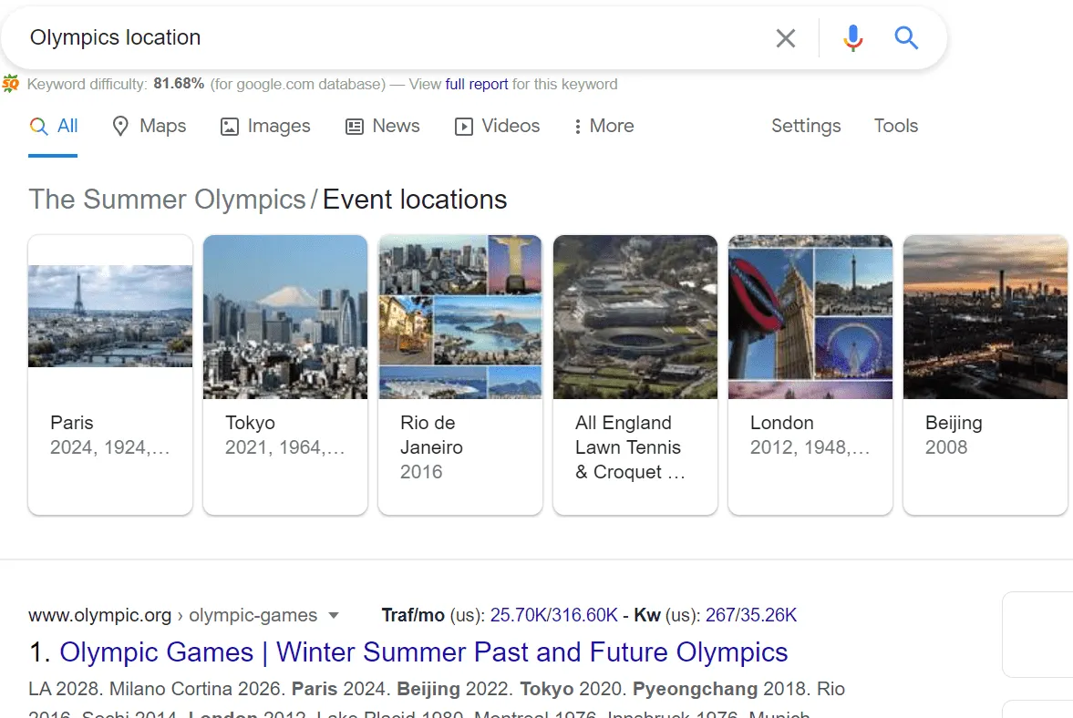 Rankbrain gives results based on search intent. Thus, when a user searches for ‘Olympics location, it shows the right result and the previously held locations, citing that the user may also be looking for previous tournaments and doesn't have to search it again by year. Creating content for various local search intent increases the chances of ranking your business on top.