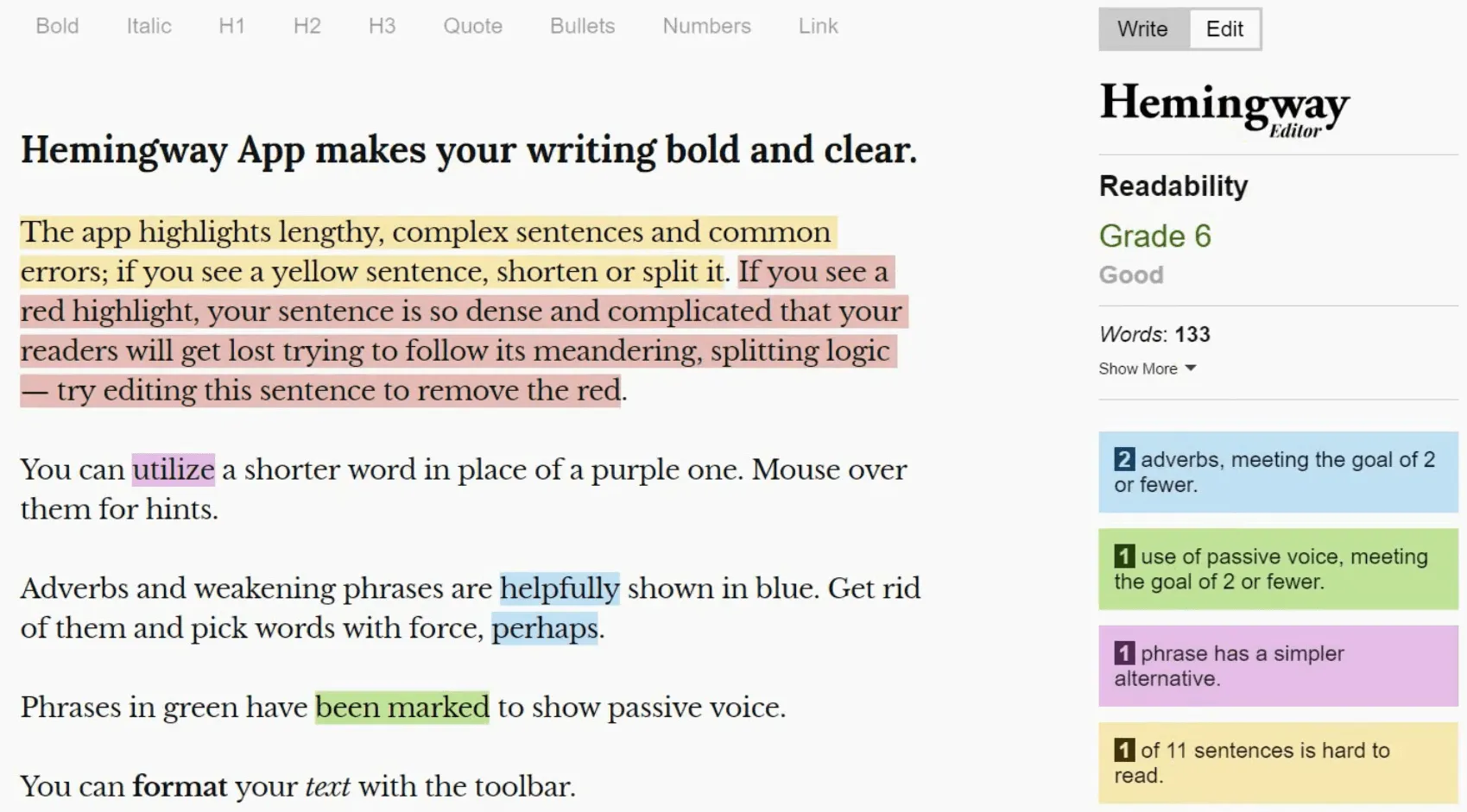 Hemingway Editor is another editing tool that gives you feedback on your content quality. But unlike Grammarly, the focus here is on optimizing your content to make it more readable. It highlights areas that may have text that is difficult to read, which you can then simplify for your readers.