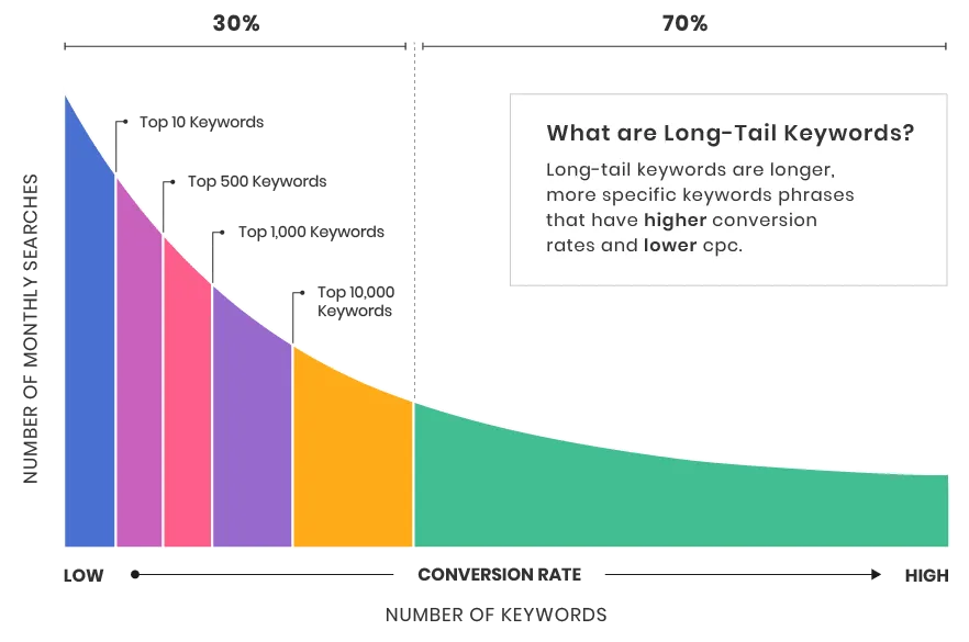 Long-tail keywords are longer, more specific search terms. These usually consist of 3 to 4 words. Long-tail keywords are easier to rank for, but their search volume is low.