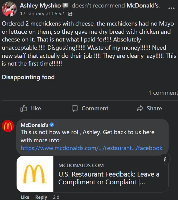 Here’s an example of McDonald’s responding to a negative recommendation: