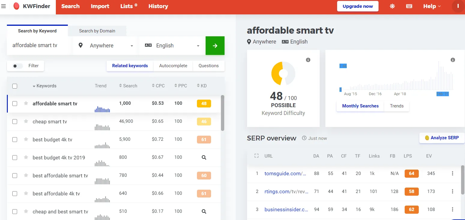 About : KWFinder is an SEO tool specializing in finding easy-to-rank keywords that elevate your search rankings on Google. It makes it easy to plan new content based on the historical performance of certain keywords specific to your industry.
