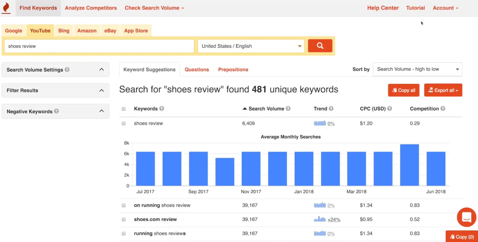 - Keyword idea generation from multiple sources: Google, YouTube, Amazon.