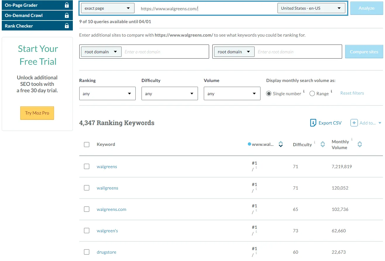 About : Moz keyword explorer is a popular software for performing detailed keyword and SERP analysis for your website. It enables you to generate high-performing keywords using various techniques and metrics scraped from your competitor's websites.