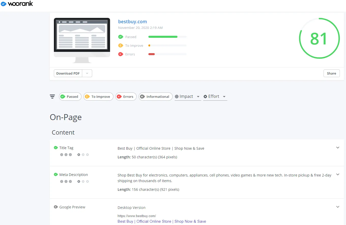 - Powerful site crawler generates a detailed report about possible technical issues on your site that impact your SEO scores.
