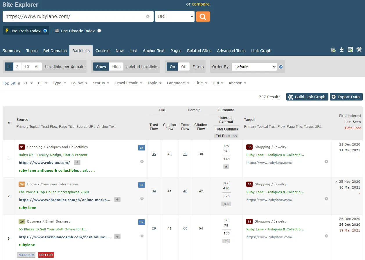 - Unique link metrics that give you deeper insights into backlinks. These include Trust Flow, Citation Flow, and Context reports, among others.