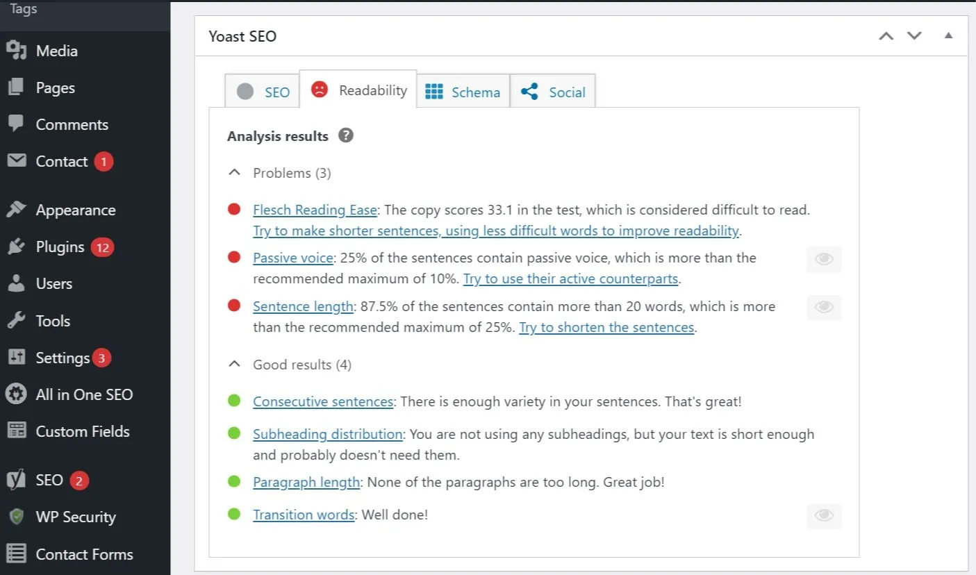 Yoast rates the quality of your content in two key areas. Readability and SEO-readiness. You also get about issues with sentences, passive voice, and more.