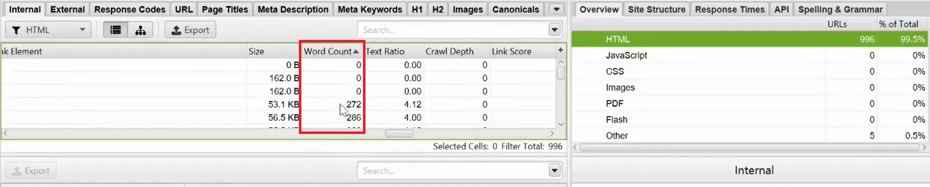It shows all the URLs with fewer word counts, HTML issues, etc.