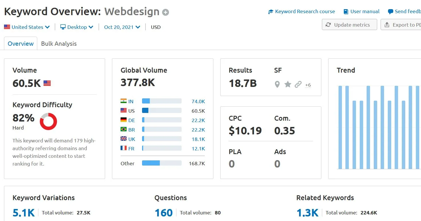If you are a newbie to SEO, then this tool is a great start. You don't even have to open an account to search for keywords. Just feed your seed words, and you'll get suggestions in an infographic-style format.