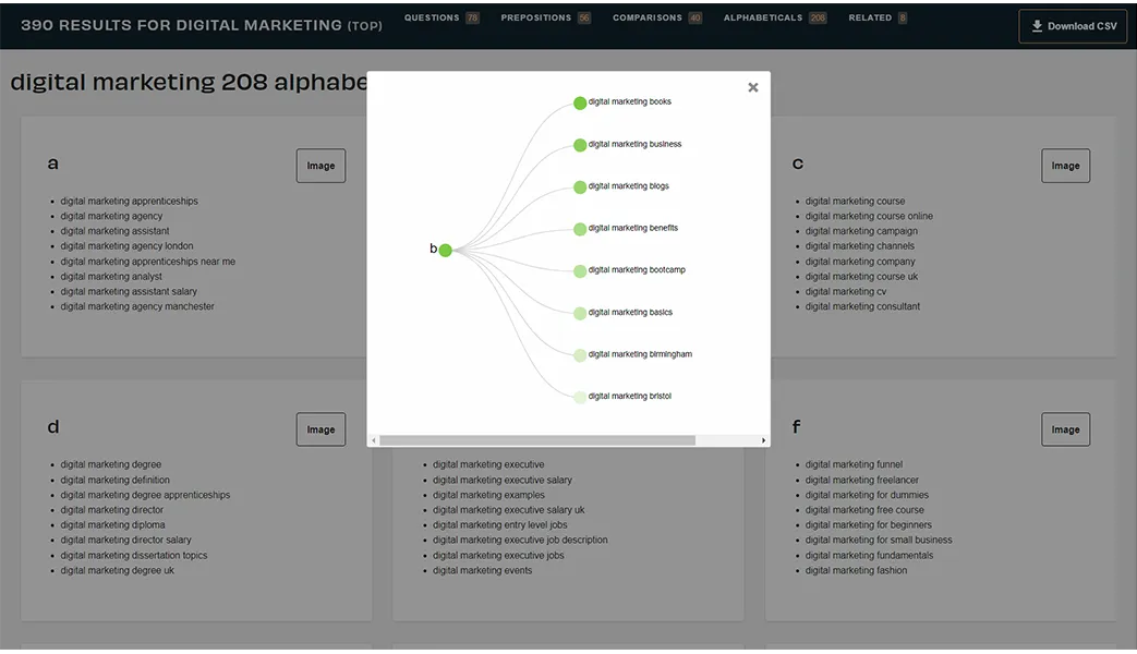 AnswerThePublic pulls these key phrases from the autosuggestions of major search engines. All the keywords can open into another tap if you click on them, making keyword selection easier. You, however, will need their pro version if you want more features.