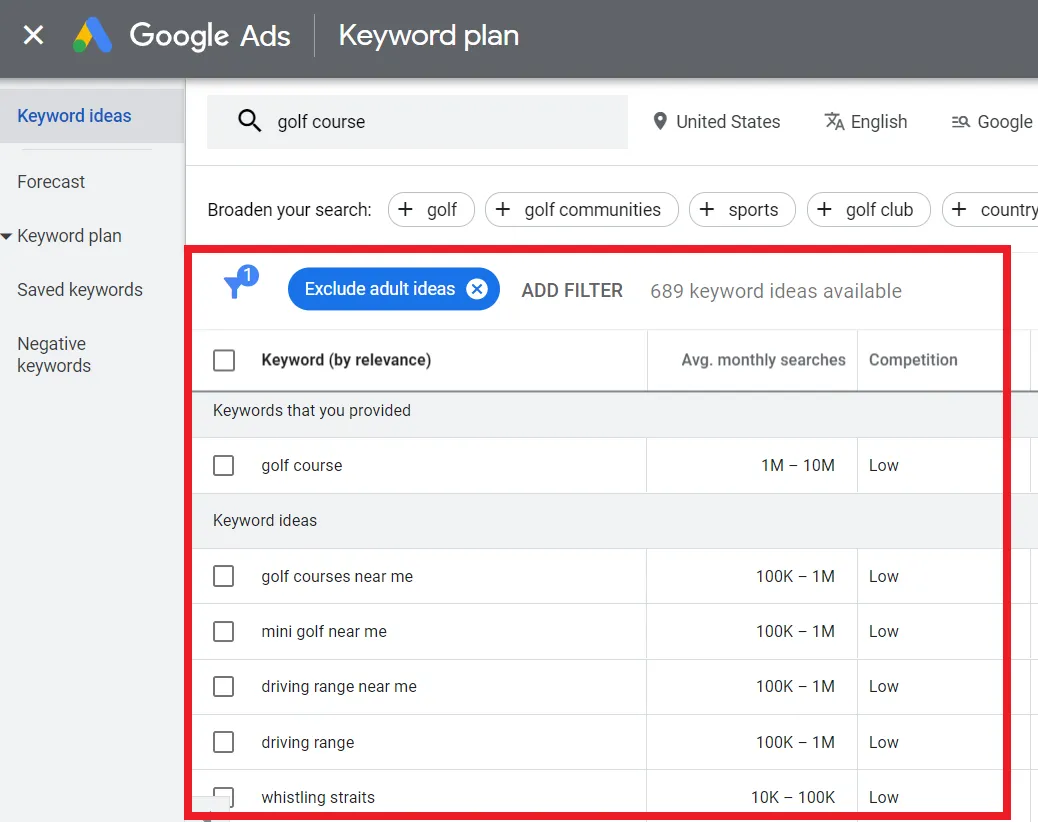 All keywords fall into two primary categories; buying intent keywords and research intent keywords. Buying intent keywords are simple and clarify the user's search intent to avail of your golf course services.