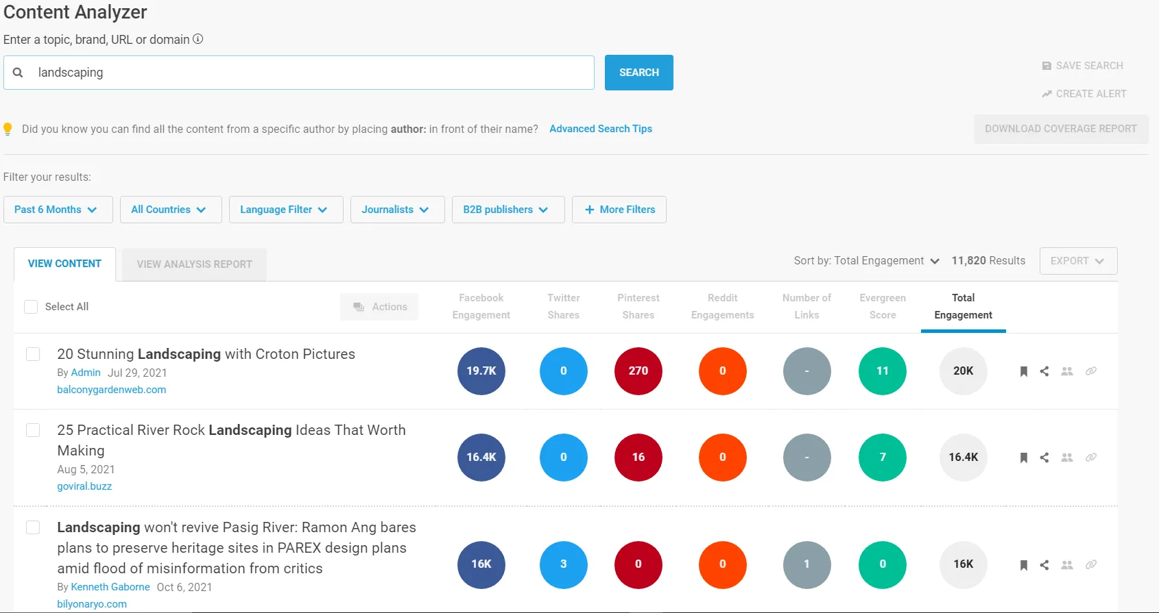 Here’s a screenshot of Buzzsumo showing what type of content with the keyword ‘landscaping’ performs the best: