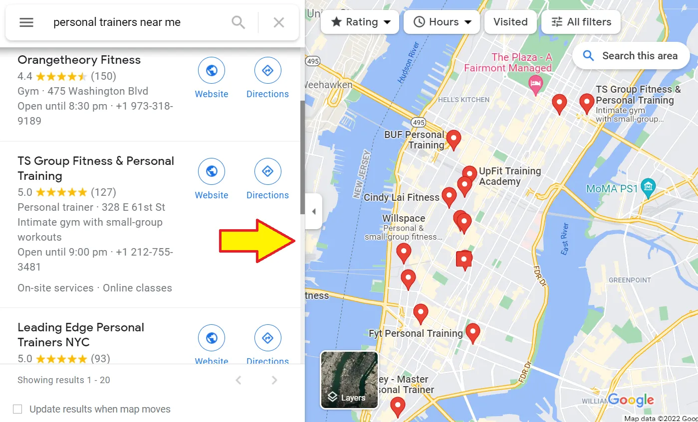 Here’s a screenshot of Google maps displaying personal training businesses present in New York.