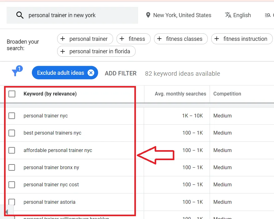 Here’s an example of keywords that personal trainers in new york can include in their webpages to rank on top in new york SERPs.