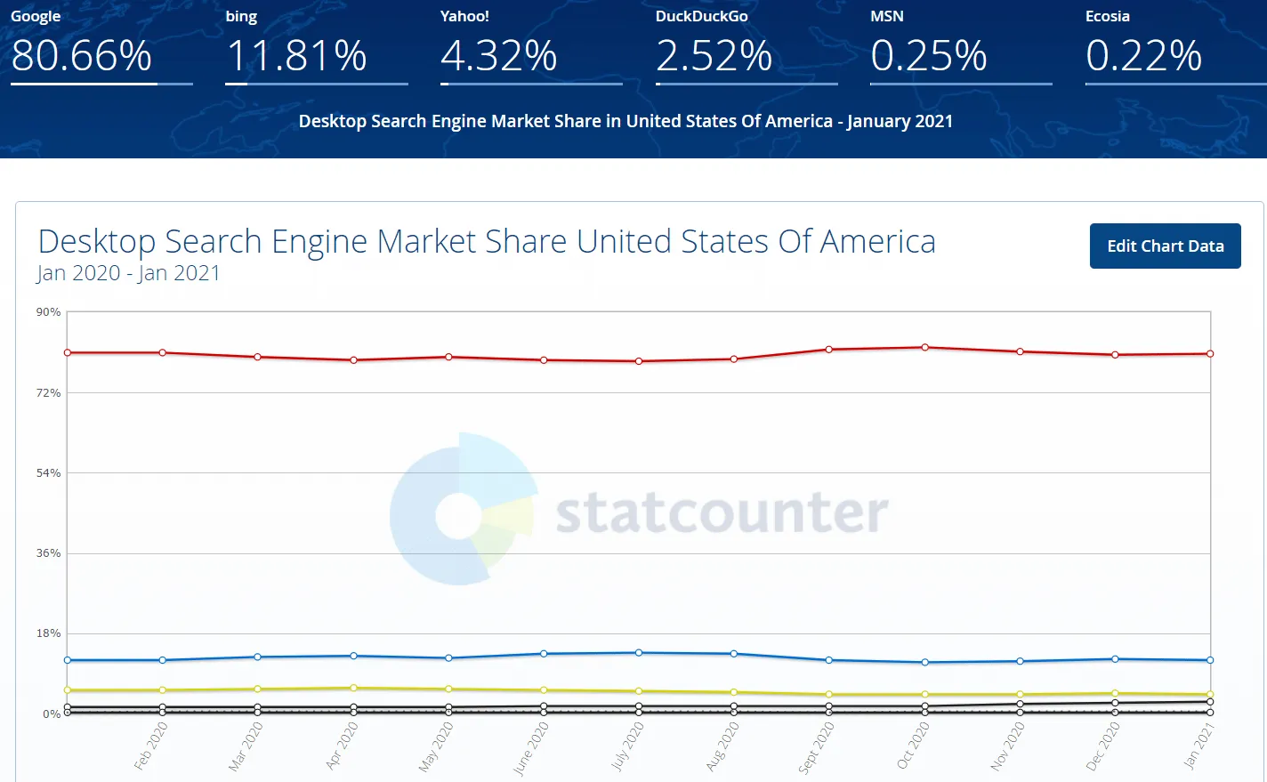 Businesses shouldn’t overlook these search engines so as to not miss even a single potential customer. Here’s the 2021 stats on how the global searches are divided on various search engines.