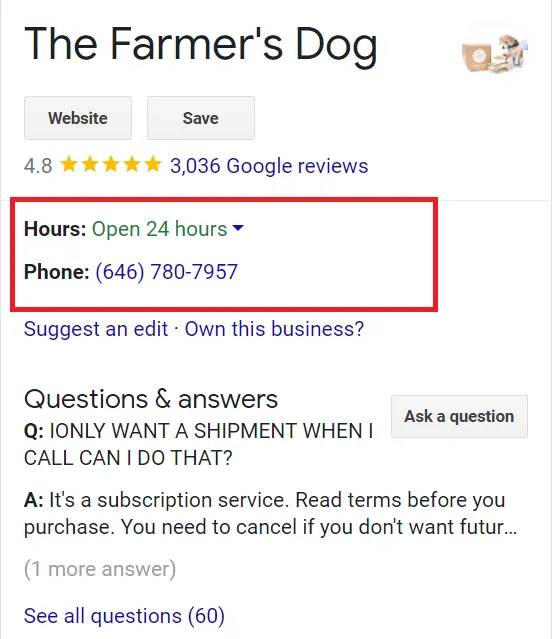 Here’s a site ranking in GMB, which unfortunately have only a phone number instead of clear contact details.