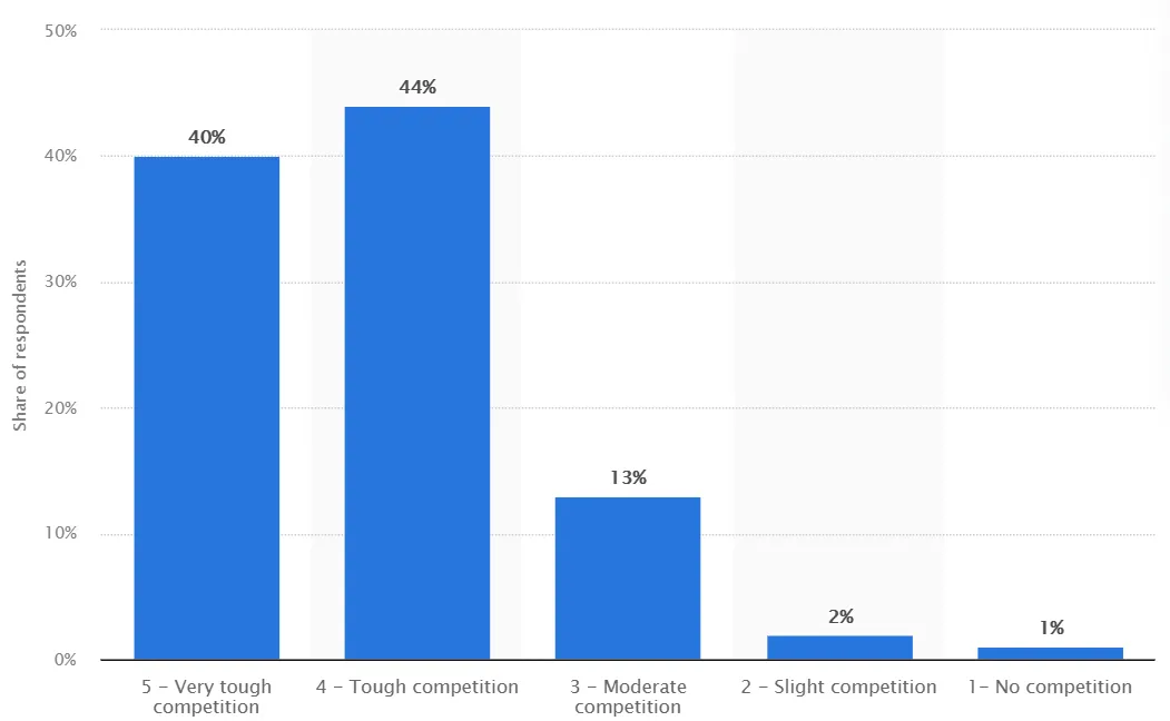 Based on a survey made on global ecommerce stores, more than 80% of the businesses say they have tough or very tough competition in the market, while only 1% of them assume to have no competition.