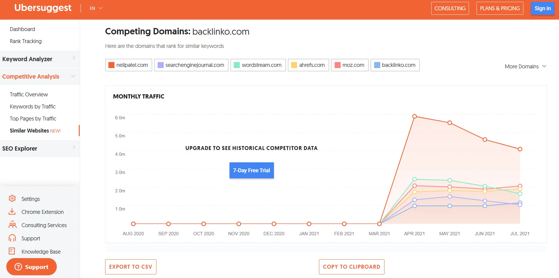 Ubersuggest gives you more than just a peek into your competitor's traffic, estimated visits, backlinks, social shares, etc.