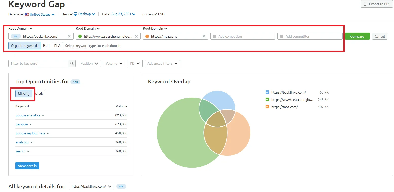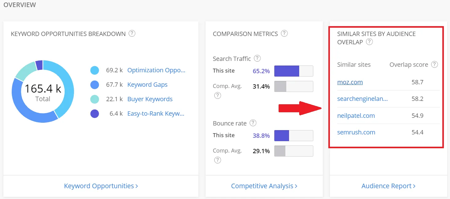 One of the essential things in a competitor analysis is to find the gaps in keyword rankings. Once you know that your competitors are ranking better than you, discover why.