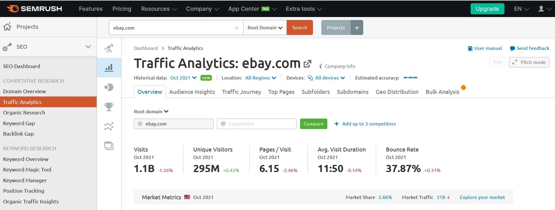 You can get reports on a competitor's average position, website visibility, traffic and discover the keyword and ad data they use in their paid or organic campaigns.
