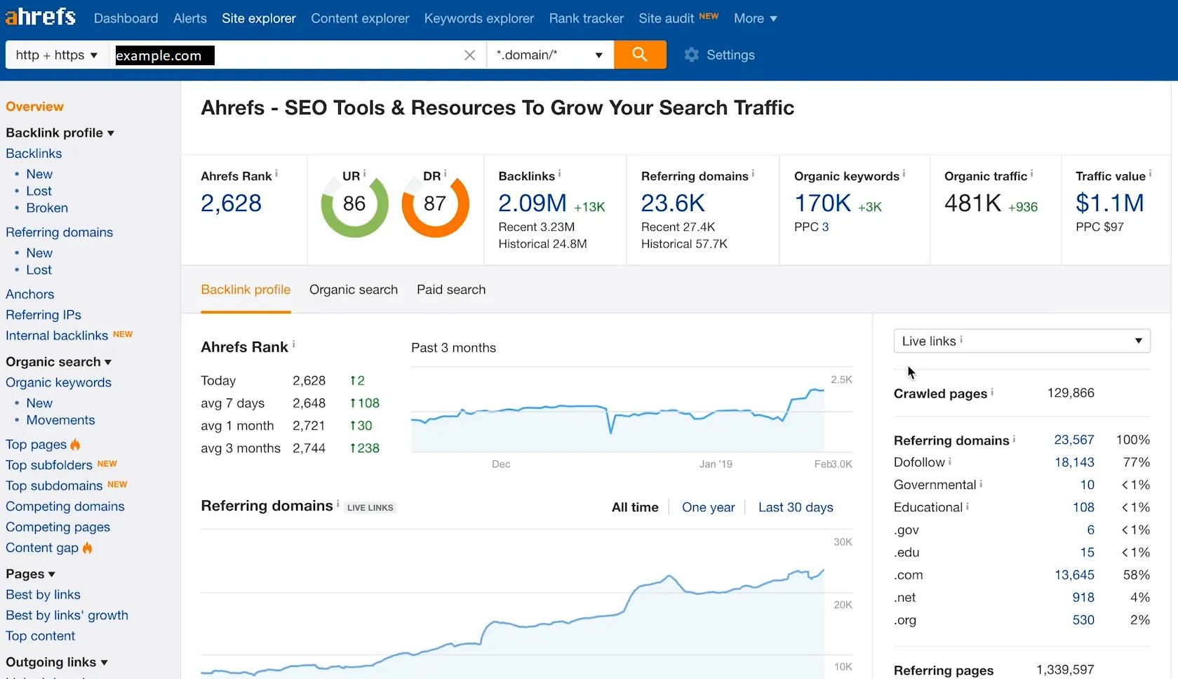 Ahrefs is a great SEO tool and resource to use to grow your traffic. More traffic means your website has more authority in the eyes of search engines, which will lead to a higher website rank. Basic plans start at USD 99/ month.