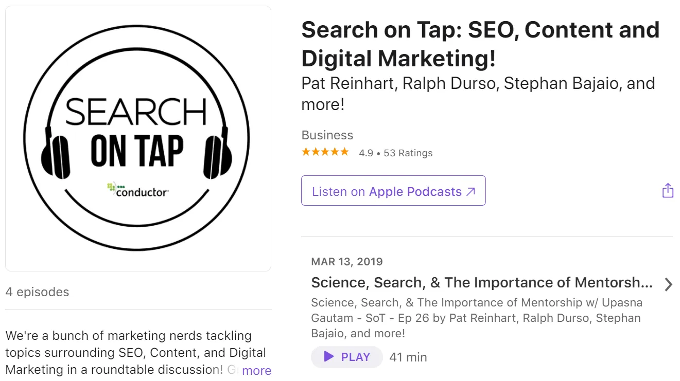 With several people hosting from the Search on Tap crew, the focus is on the people they invite. They have some well-established names from the SEO world like Rand Fishkin on their podcasts.