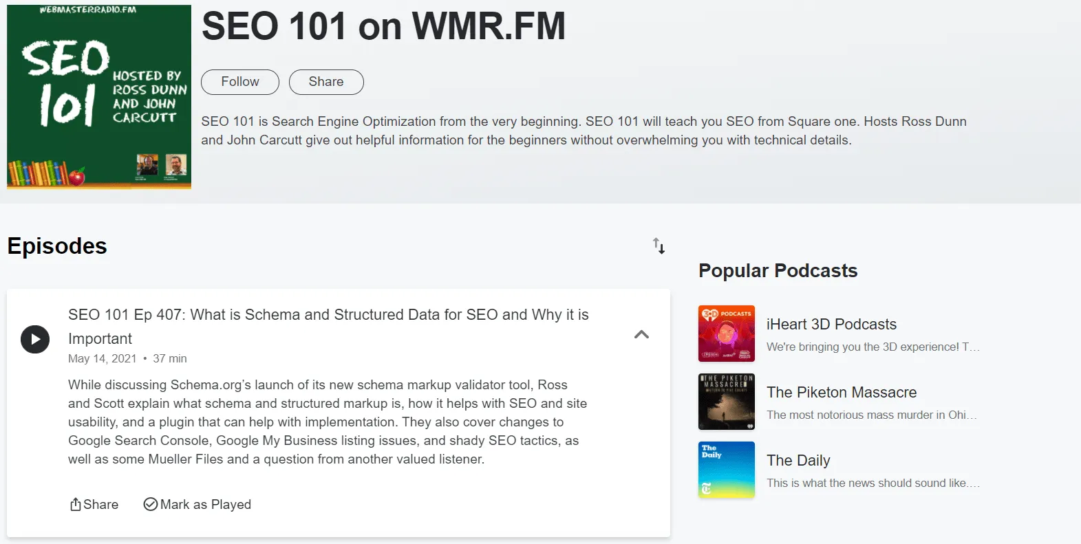 If you are looking for a more starting from the basics approach to SEO, then SEO 101 is something you want a subscription to. This podcast is part of the WMR.FM website and has a lot of information about getting started on SEO.