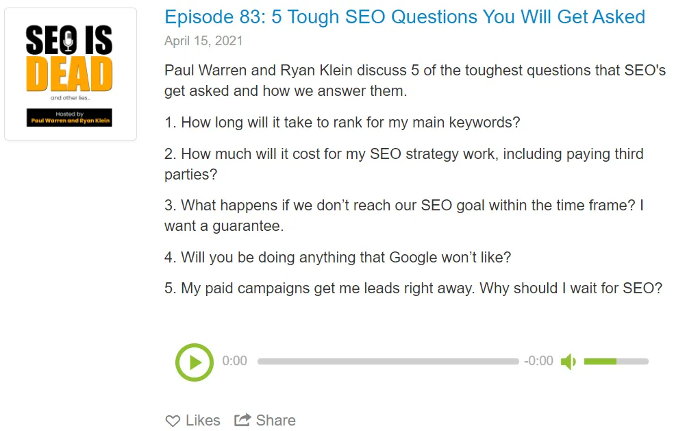 SEO is Dead, and Other Lies is one of the more recent podcasts, but it brings a lot to the table. The hosts of this podcast are Paul Warren and Ryan Klein.