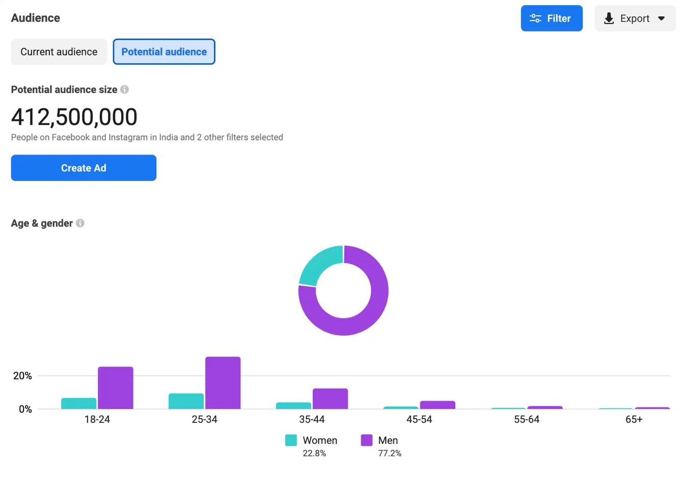E.g., Check these insights from Facebook > Insights > Potential Audience section from a business page. It will display the audience based on Age & Gender.