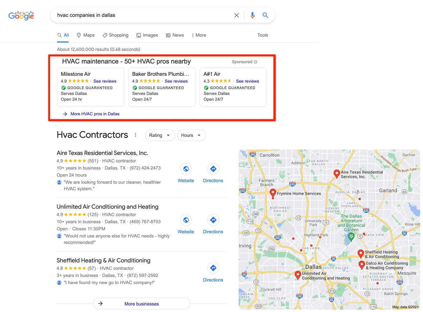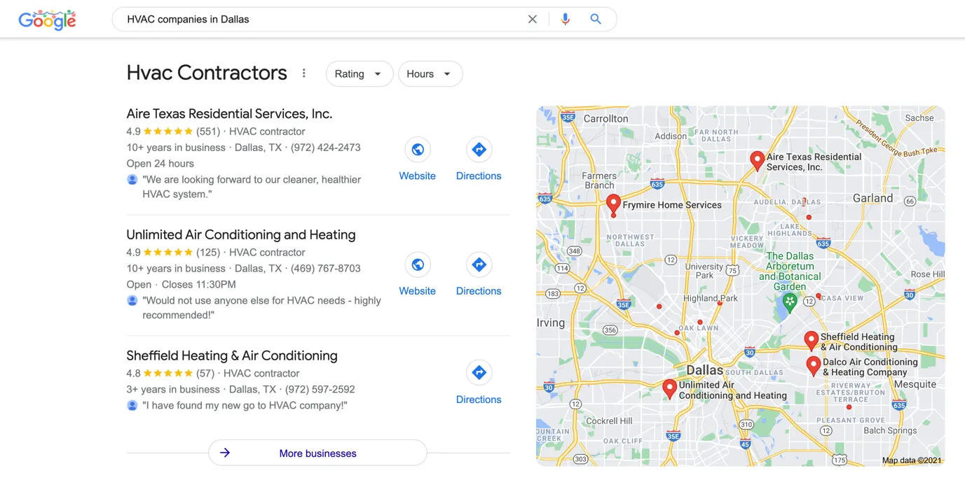 Here is a screenshot of the local 3-pack results for” HVAC companies in Dallas” –
