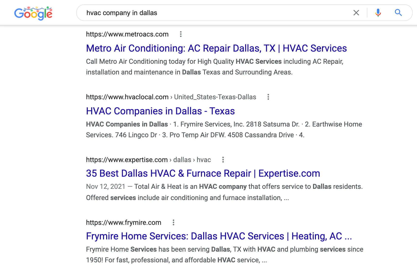 For example, Have a look at these websites ranking at the top in organic searches for “HVAC company in Dallas”