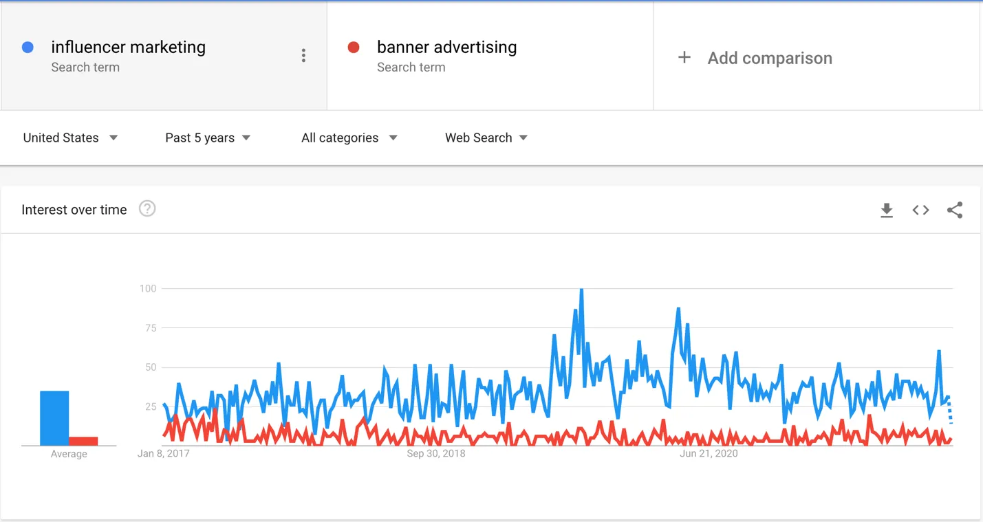 Have a look at the difference in search trends for Influencer marketing VS banner advertising over the past five years.