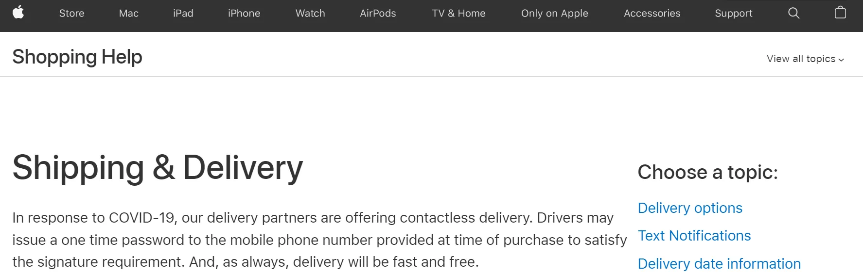 Here’s an example of Apple displaying a shipping disclaimer on their website in light of the pandemic:
