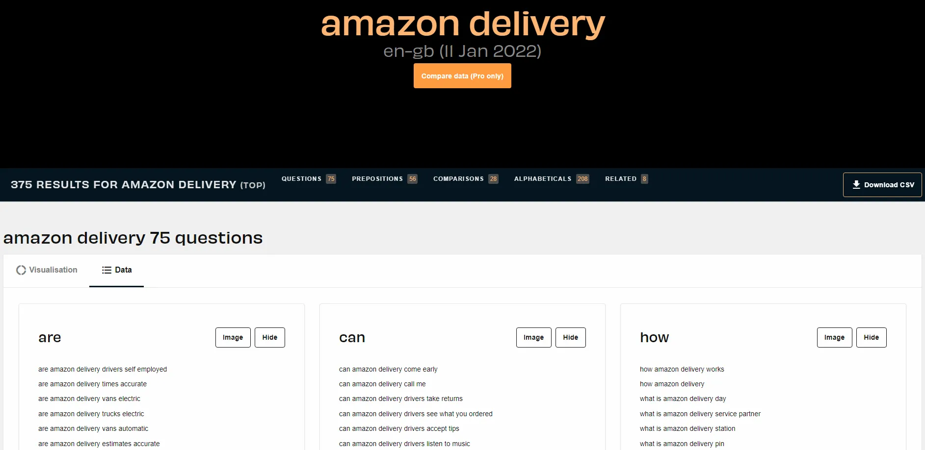 Here’s an example of AnswerThePublic showing what people are saying about Amazon’s delivery:
