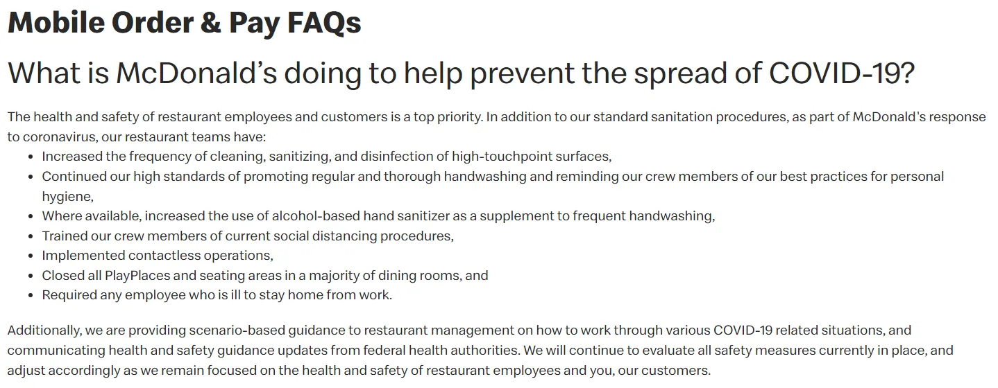 Here’s an example of McDonald’s providing educational content on how it is curbing the spread of COVID-19 on their website: